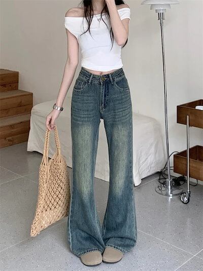 2025春夏パンツ デニム ジーンズ ワイド ストレート ハイウエスト 脚長効果 美脚効果 細見え ウォッシュ加工 夏 カジュアル おしゃれ かわいい 韓国ファッション レディース お出かけ