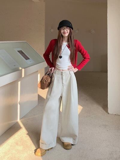 2025 パンツ デニム ジーンズ ロング丈 ワイドレッグ ハイウエスト 美脚効果 脚長効果 細見え 秋 エンジ 赤 白 おしゃれ かわいい 韓国ファッション レディース お出かけ