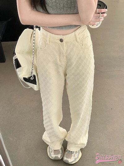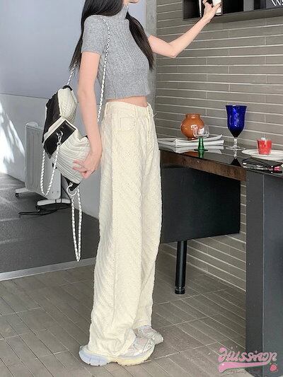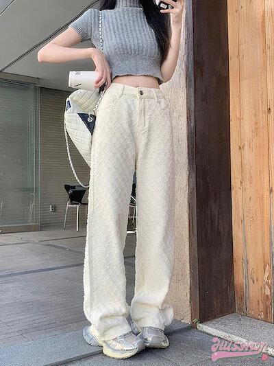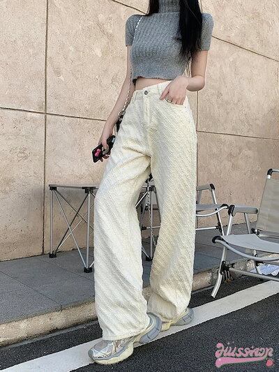 パンツ デニム ジーンズ モップパンツ ジャガード ワイド ストレート ハイウエスト 脚長効果 美脚効果 細見え 春 カジュアル ホワイト 白 韓国ファッション レディース お出かけ