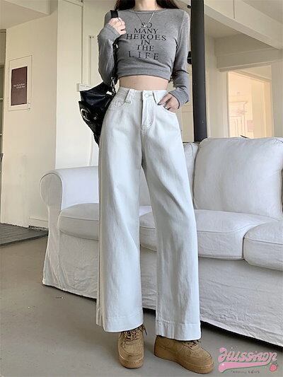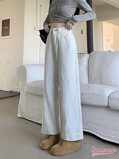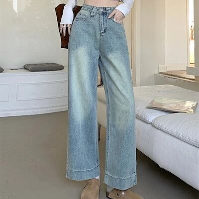 パンツ デニム ジーンズ ワイド ストレート ハイウエスト 脚長効果 美脚効果 細見え ウォッシュ加工 春 白 カジュアル 韓国ファッション レディース お出かけ
