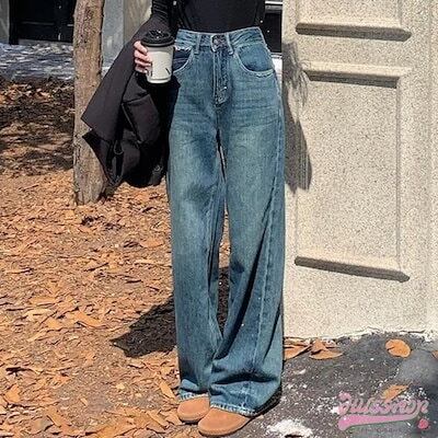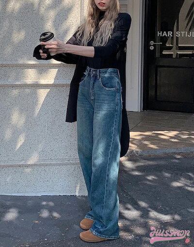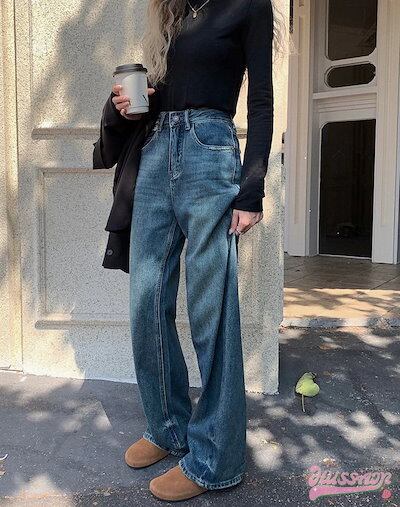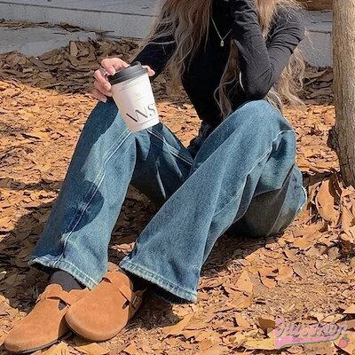 パンツ デニム ジーンズ モップパンツ ステッチ ワイド ストレート ハイウエスト 脚長効果 美脚効果 細見え 春 カジュアル 韓国ファッション レディース お出かけ