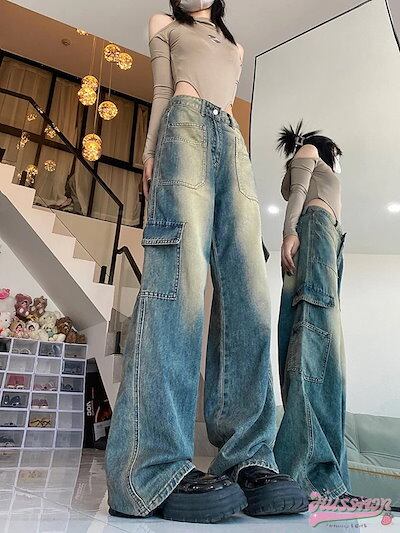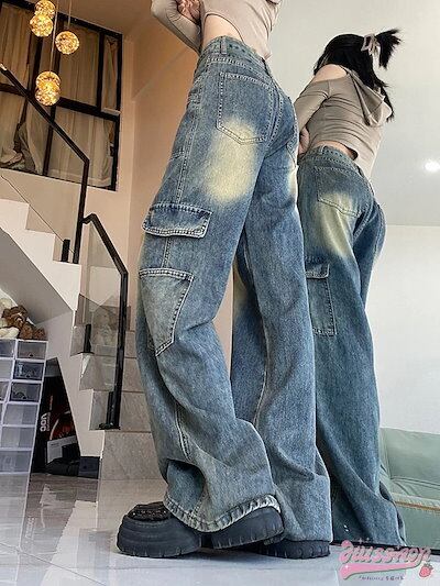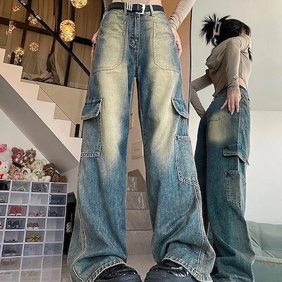 2025春夏パンツ デニム ジーンズ ワイド ストレート ハイウエスト 脚長効果 美脚効果 細見え ウォッシュ加工 ポケット 春 カジュアル 韓国ファッション レディース お出かけ