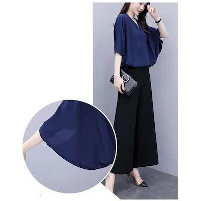 【GUANGYU】セットアップ パンツスーツ レディース 夏 春 シャツ ブラウス 5分袖 ロングパンツ ガウチョパンツ 着痩せ 体型カバー フォーマル お呼ばれ 通勤
