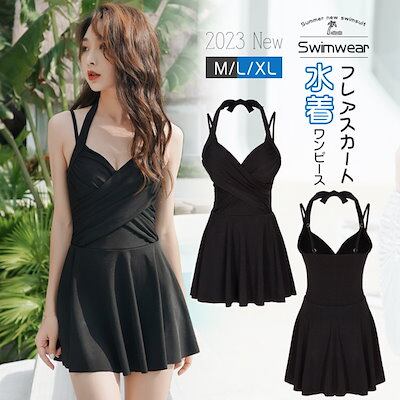 水着 ワイヤーあり 盛れる レディース ワンピース オールインワン 体型カバー フロンクロス ウエストマーク フレアスカート オトナ女子 ナチュラル フェミニン ママ水着 フリル 無地 エレガント