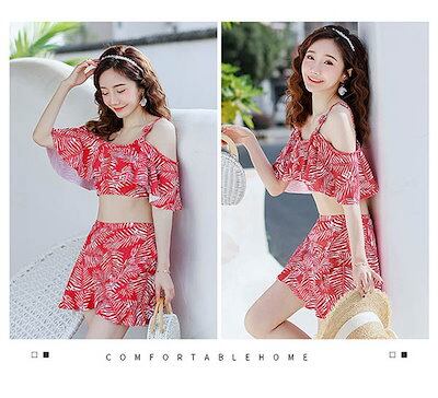 フレア水着 タンキニ レディース オフショルダー 半袖付き キャミソール インナーパンツ ハイウエスト ボーイレッグ ワイヤーなし パッド付 ボタニカル柄 リーフ 葉っぱ 体型カバー セパレート 海