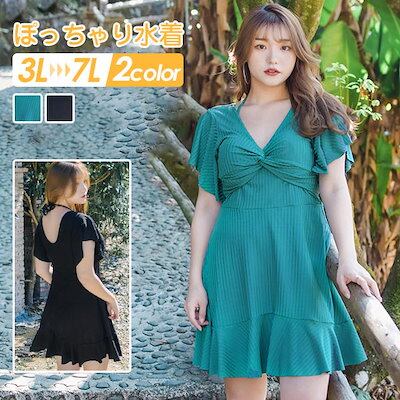 レディース ぽっちゃり 大きいサイズ 水着 体型カバー ワンピース Vネック 背中だし 着痩せ ワイヤー入り パッド付 7L 服みたいな水着 ビーチ 海デート 温泉 セクシー 大人可愛い ブラック マ