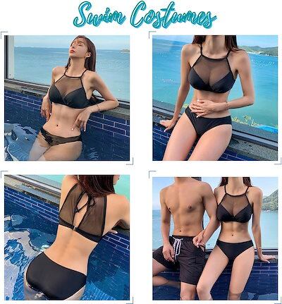 レディース 水着 ビキニ 2点セット シースルー セクシー水着 女性水着 セパレーツ 透け感 上下セット タンキニ スイムドレス ビーチウェア ブラック水着 単色水着 ック ワイヤー入り メッシ
