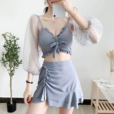 2色 水着 ドット 透け感 セクシー タンキニ ミニ ショート丈 シック カッコイイ 体形カバー ツーピース 2点セット 大人 お姉さん イイ女 スタイルアップ モテ レディース ブラック グレー 黒