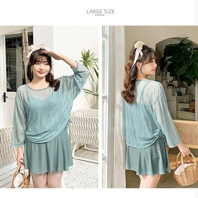 水着 レディース ビキニ 女の子 大きいサイズ 4L 5L 6L 体型カバー グリーン セパレート ブラ ショートパンツ 羽織り ラッシュガウン かわいい 二の腕カバー お尻カバー お腹カバー 露出控