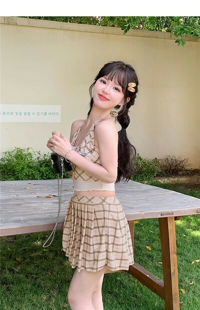 水着 レディース セパレート めくれ防止 チェック カーキ 体型カバー 女子水着 ショーツ付き セパレート スカート 肩出し フリル 可愛い 大人女子 20代 30代 二の腕 水着 ビキニ タンキニ
