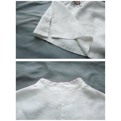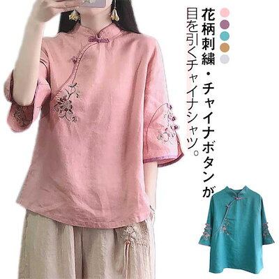 チャイナシャツ レディース 綿麻 エレガント トップス チャイナ風 刺繍 ブラウス リネンブラウス 七分袖 チャイナボタン 前開き 花柄 薄手 プル