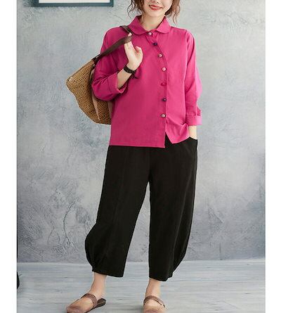 シャツ レディース トップス 春 秋 長袖 ブラウス 綿混 コットン 無地 ゆったり 立ち襟 斜めボタン 大きいサイズ ゆったりシャツ おしゃれ カジュアル リラックス 30代 40代 50代