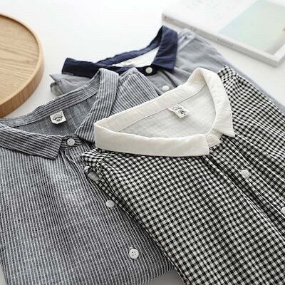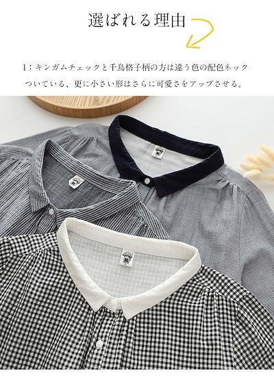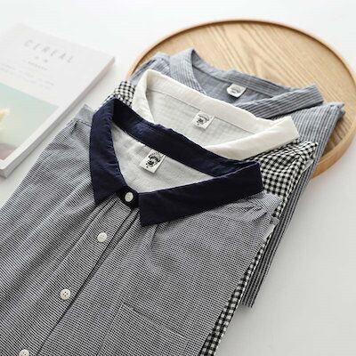 シャツ レディース キンガムチェック ストライプ 千鳥格子柄 ガーゼ トップス 長袖 襟付き 小襟 ボタン留め 前開き 綿 シャツブラウス 可愛い チェック柄 ダブルガーゼ 折襟 レギュラカラー カジ