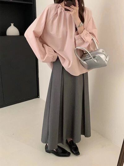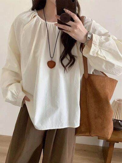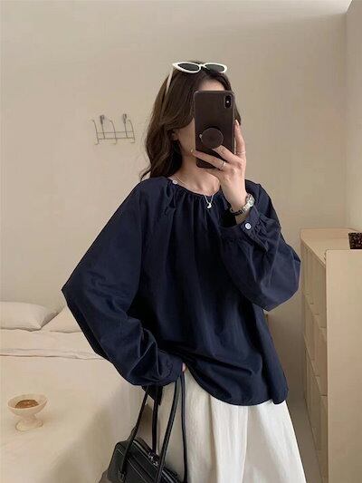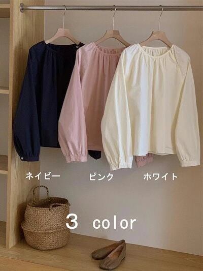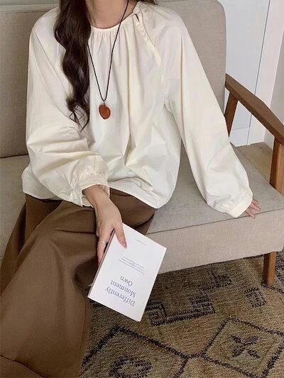 長袖ブラウス レディース タック ブラウス シャツ トップス オフィス 長袖 スーツ インナー 丸首 プルオーバー ラウンドネック Aライン ぽわん袖 バルーン袖 ボタン付き コットン 白シャツ 無地