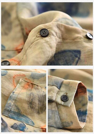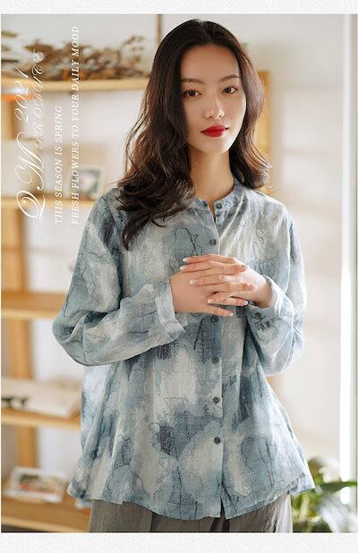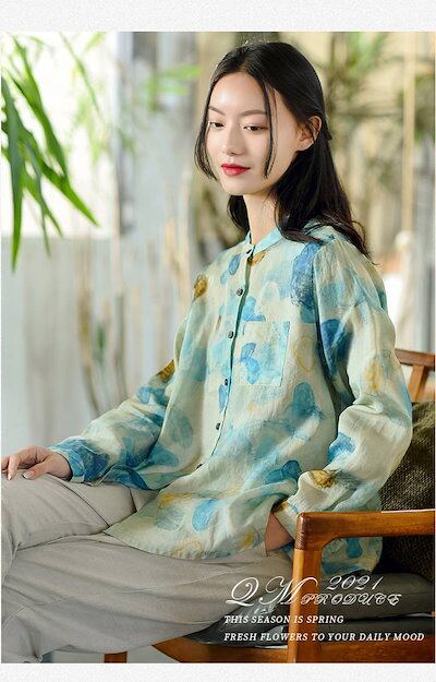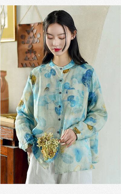 リネンシャツ 春夏 前開き ボタン留め シャツブラウス 総柄 フレア 立ち襟 トップス レディース 長袖 ゆったり カジュアル おしゃれ バックタック