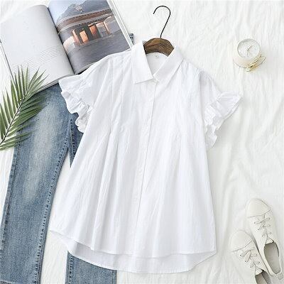 シャツ ブラウス 半袖 レディース シャツブラウス 白シャツ 折り襟 綿シャツ 綿 半袖シャツ フレンチスリーブ フリル フレア 前後差 アシンメトリー 不規則裾 ボタン止め 夏シャツ トップス 大き