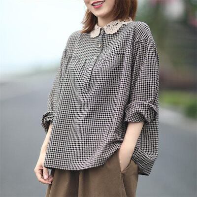レース丸襟 シャツブラウス かわいい レディース 春秋 シャツ ブラウス 長袖 トップス 綿混 カジュアル 春トップス 秋トップス チェック 切り替え ギャザー ボタン 大きいサイズ 体型カバー 通勤