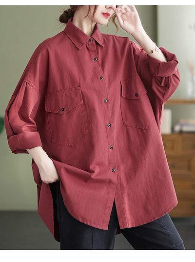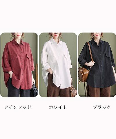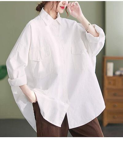 ドルマン シャツ レディース チュニック ブラウス 長袖 大きいサイズ ロングシャツ コットン 折襟 ドロップショルダー 秋 トップス 秋物 アウター 前開き ポケット付き ワイシャツ 無地 白シャツ