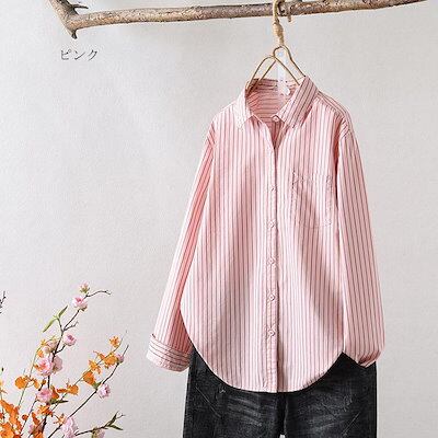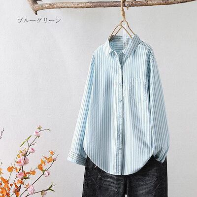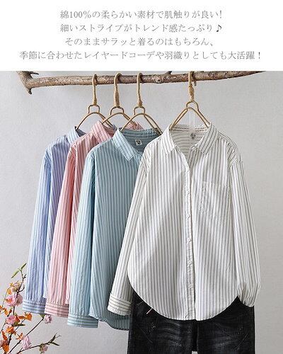 綿 ストライプ 長袖 シャツ レディース ベーシックシャツ チュニック トップス 大きいサイズ 綿シャツ 前開き 長袖シャツ 背中タック 羽織 レギュラーカラー コットン 折襟 体型カバー シンプル