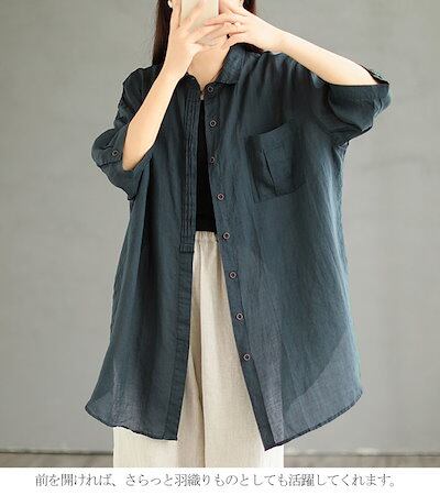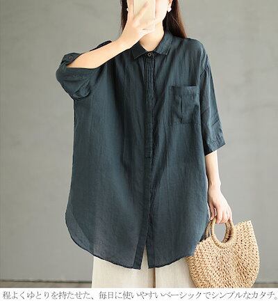 半袖 シャツブラウス レディース チュニック 綿麻風 半袖シャツ シャツ ブラウス トップス Vネックシャツ 半袖 折襟シャツ 七分袖 前後差 ミドル丈シャツ 無地 ボリューム袖 大きいサイズ 前開き