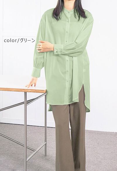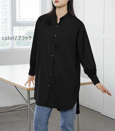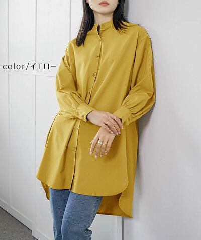 シャツブラウス レディース 長袖 ブラウス 春 秋 トップス チュニック ミディアム丈 ロング ゆったり 体型カバー お尻が隠れる 無地 長袖 ギャザー パフスリーブ 襟 カジュアル シンプル 楽チン