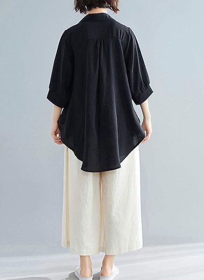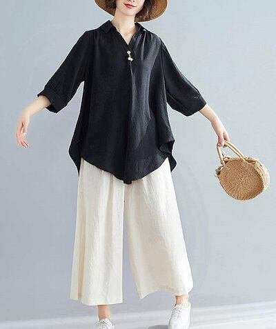 チュニック 夏 ロング丈 レディース ブラウス プルオーバー 七分袖 シャツブラウス Vネック バルーン袖 tシャツ 前後差 タック入り 切り替え トップス 大きいサイズ 折り襟 スキッパーカラー ギ