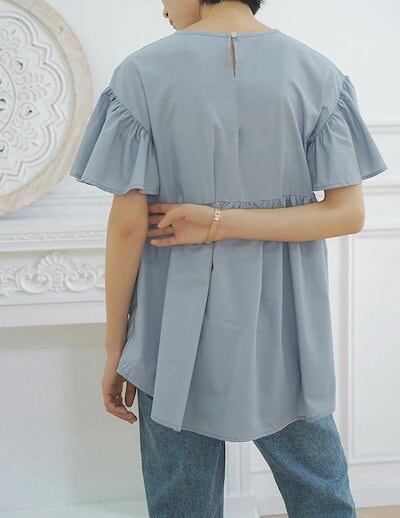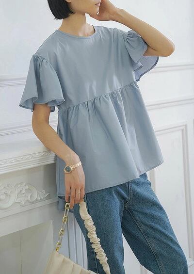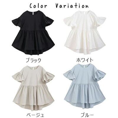 フレア袖 ブラウス 半袖 レディース 春 夏 フリル袖 トップス カットソー チュニック フリル切替 クルーネック ラウンドネック 体型カバー フレアブラウス 無地 シンプル きれいめ カジュアル か