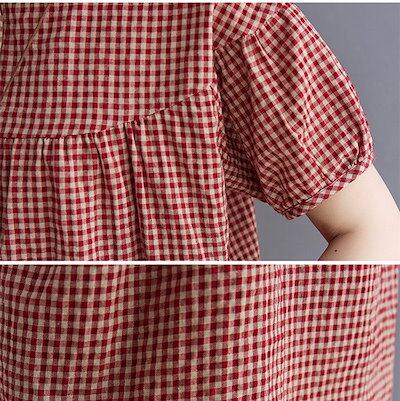 ブラウス レディース 半袖 夏 チュニック チェック柄 チュニック 体型カバー シャツ 綿麻混 大きいサイズ ゆったり uvカット トップス チビ襟 レース襟 切替 シンプル 50代 30代 40代