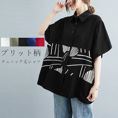 チュニック 半袖 ブラウス シャツ レディース 春 夏 大きいサイズ トップス シャツブラウス 半袖シャツ 襟付き 綿麻 チュニックシャツ ロング プリント 柄 総柄 切り替え ゆったり 体型カバー