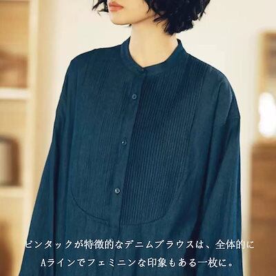 デニムシャツ レディース チュニック 長袖 ブラウス シャツ 春 ピンタック トップス 大きいサイズ バンドカラーシャツ デニム シャツブラウス 羽織 羽織もの ロングシャツ バンドカラー 無地 綿