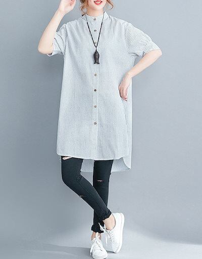 チュニック ブラウス 半袖 夏 トップス レディース ロング シャツ ストライプ ロングシャツ 半そで ストライプ柄 シャツブラウス ロング丈 体型カバー 綿麻 シャツワンピース ミドル丈 大きいサイ