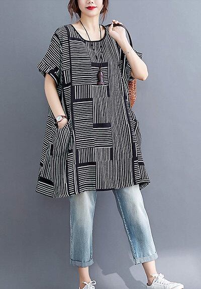 チュニック レディース 半袖 ロング Tシャツ 切り替え ストライプ ラウンドネック チュニックワンピース リネン ポケット付き トップス 大きいサイズ カジュアル ひざ丈 ゆったり Iライン 着痩せ