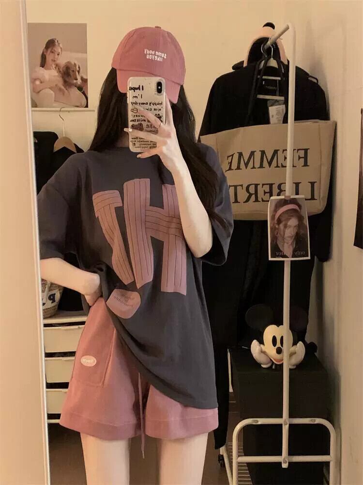 【送料無料】 アメリカンレトロ半袖 Tシャツスポーツカジュアルショーツスーツ女性の夏の 2023 新しいファッションルーズ 2 点セット サマー 夏物 ブルマー ワンピース takotako20180102a43536545329
