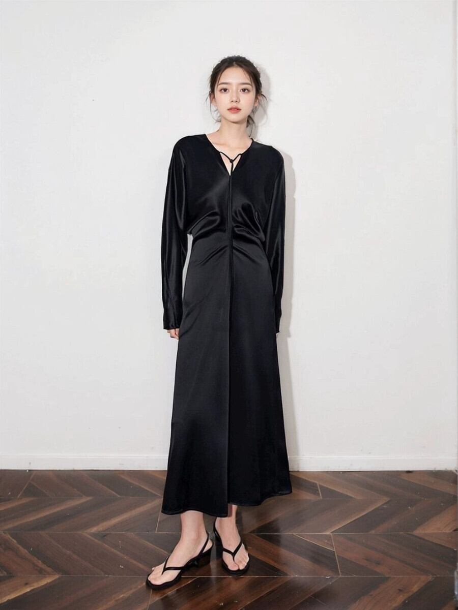 サテン気質長袖ウエストフレンチドレスオールドマネースタイル2023秋冬新作高級感と超見栄えの良いインナーウェア ロング オータム 秋物 ウィンター 冬物 トップス シャツ takotako20180208b78205611904