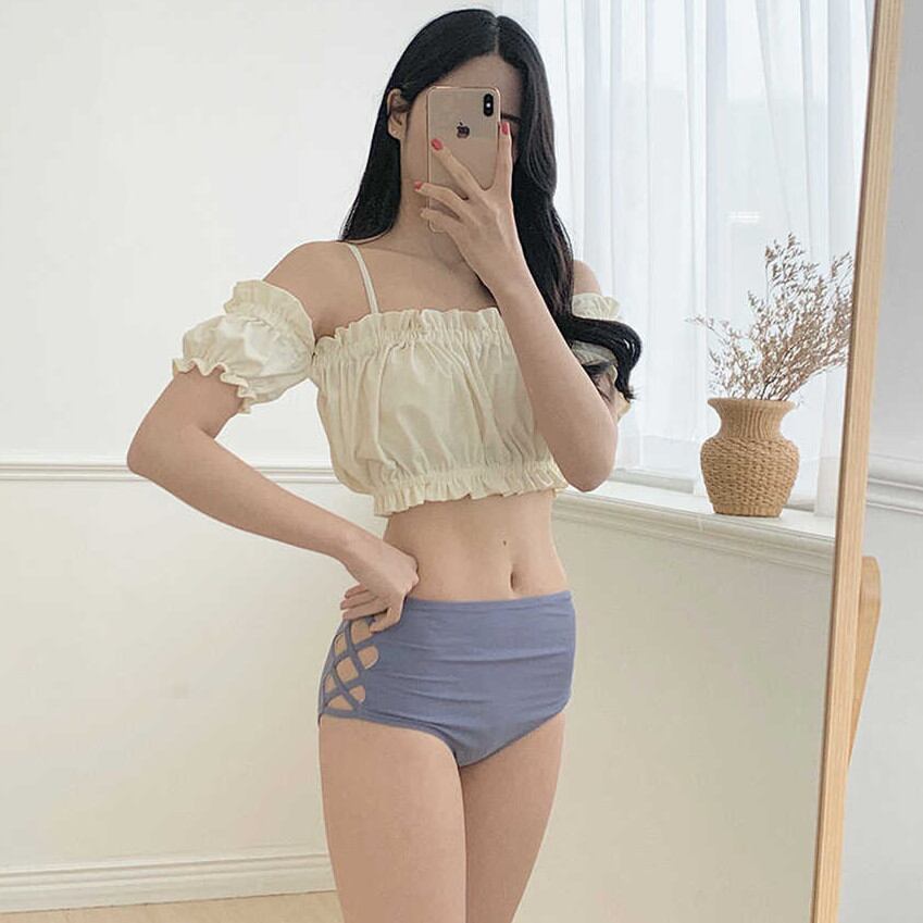 ギャザー入りのオフショルビキニは生地の厚みも良くて体型カバーにバッチリ^^