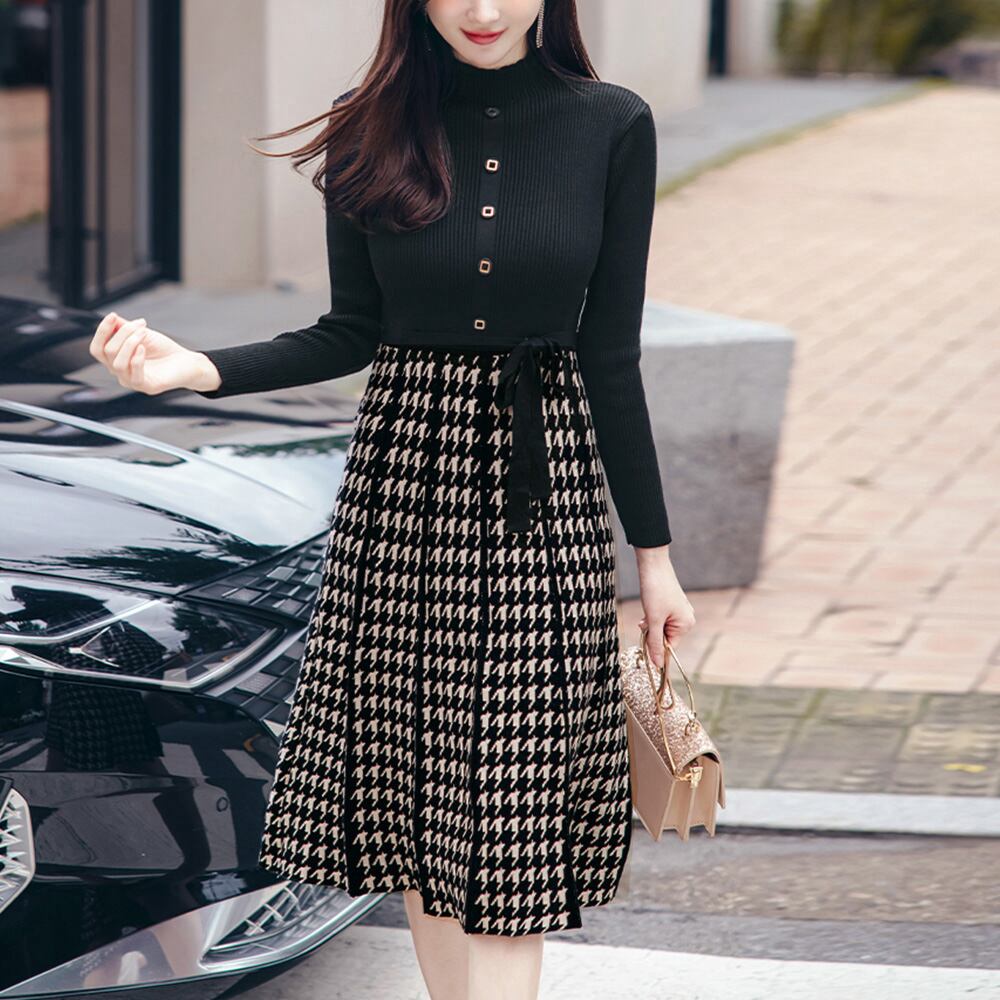 ニットワンピースレディース千鳥柄切替秋冬韓国 プチハイネック フレアワンピース Aライン きれいめ長袖ワンピース ウエストマーク 20代 30代40代オルチャン