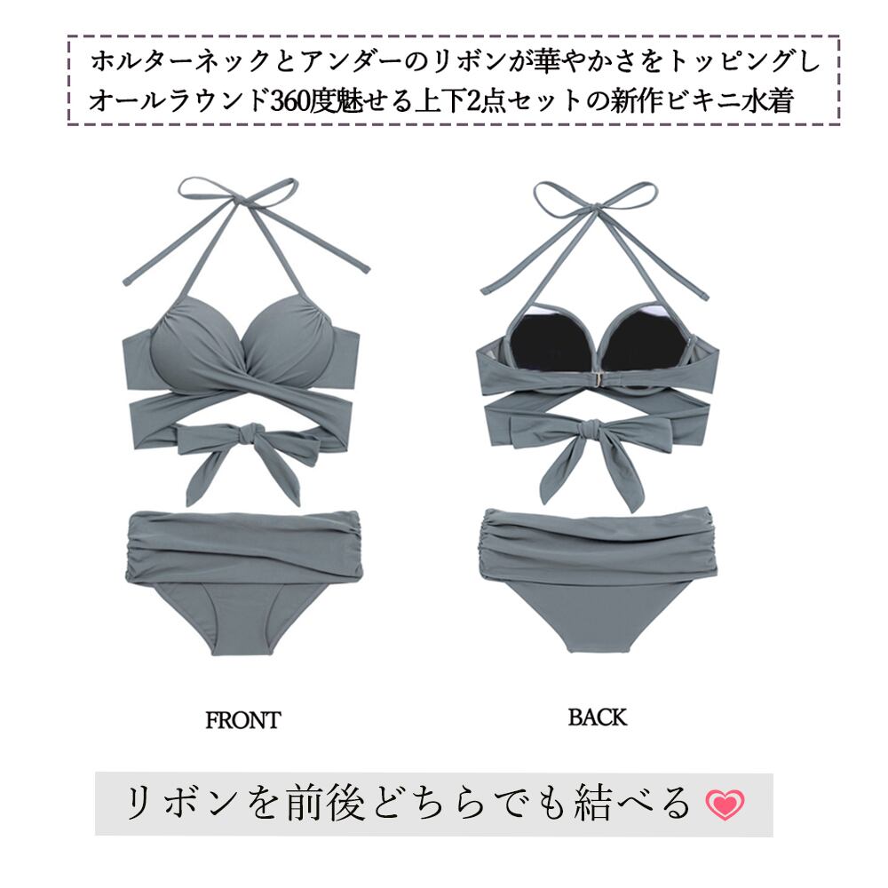 ホルターネックとアンダーのリボンが華やかさをトッピングし、オールラウンド360度魅せる上下2点セットの新作ビキニ水着