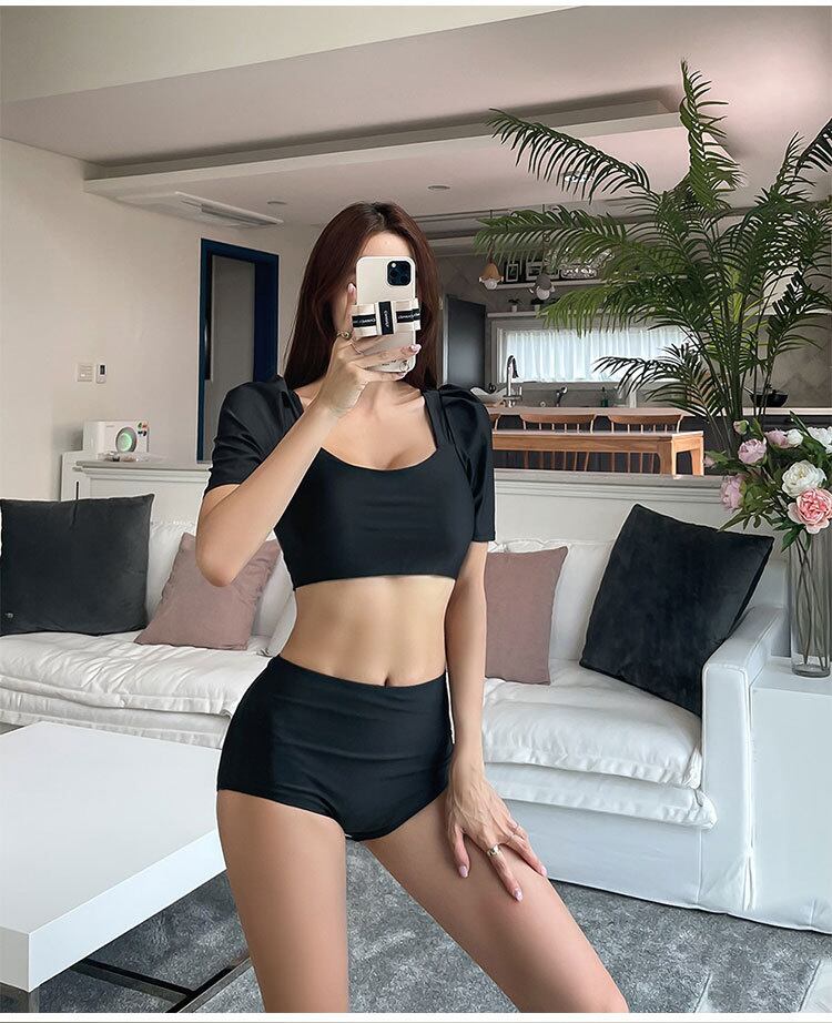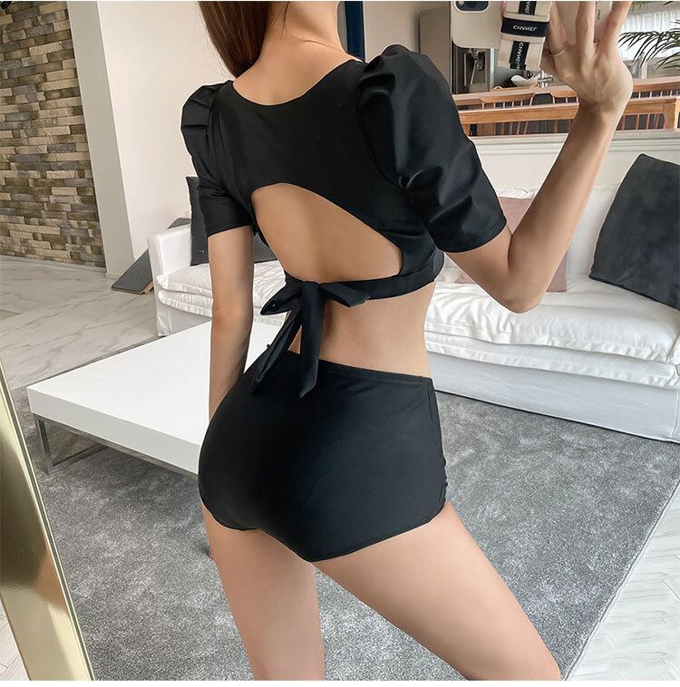 ファッション 水着 セクシー ハイウエスト 水泳 スパ パフスリーブ 背透けて