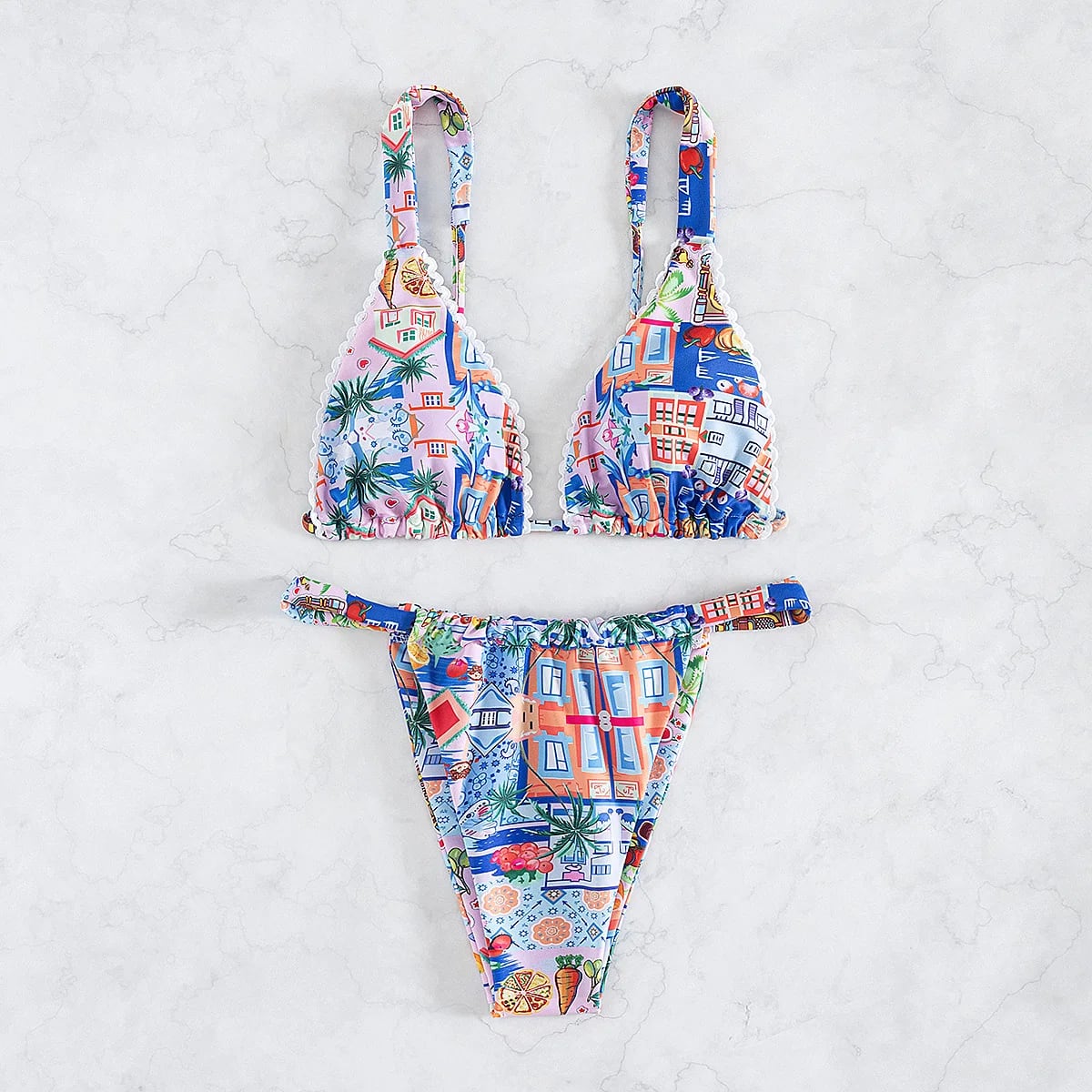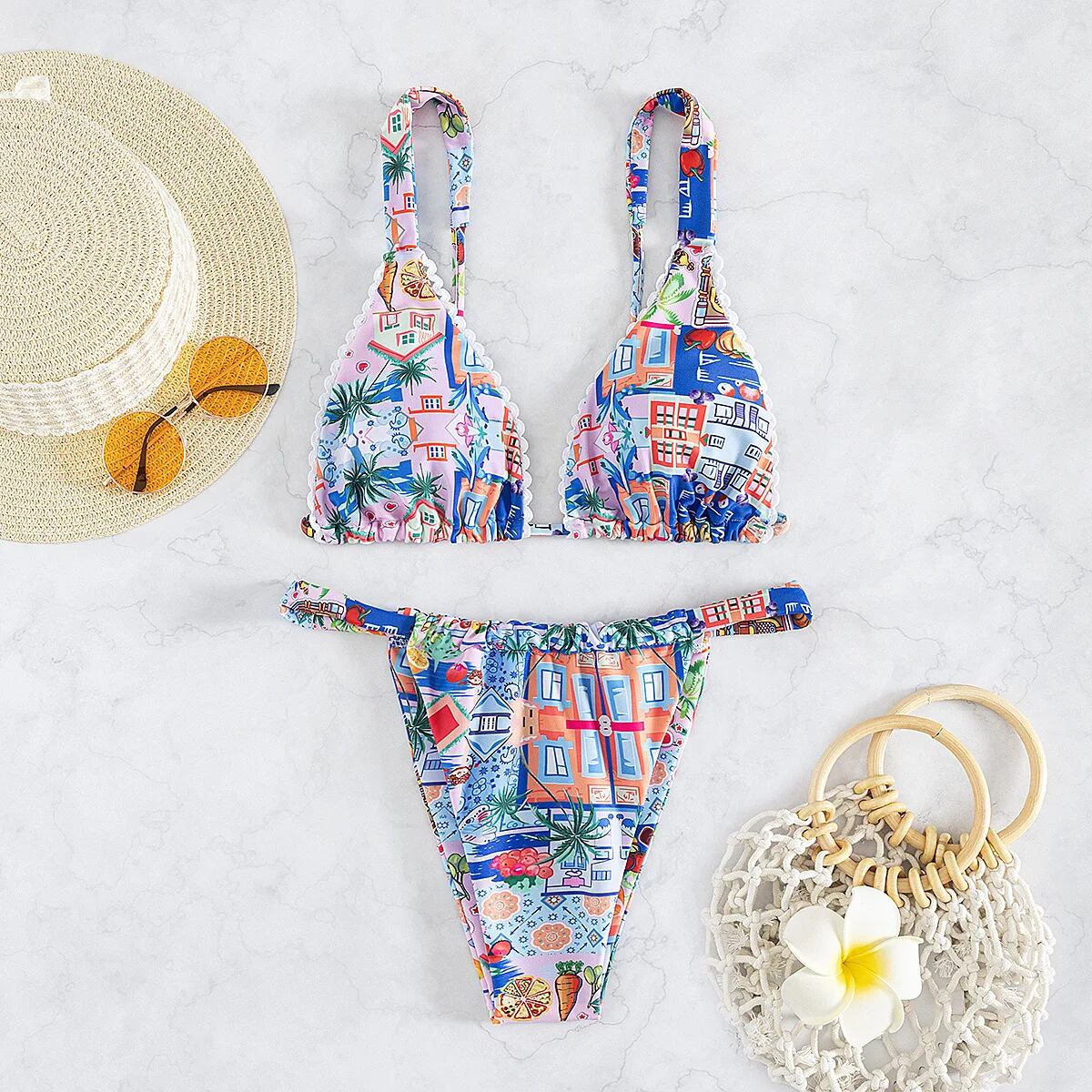 女性のための花柄のマイクロビキニ,ひもとセクシーな磁器の水着,青と白 ビキニ Tシャツ T240618235501_02
