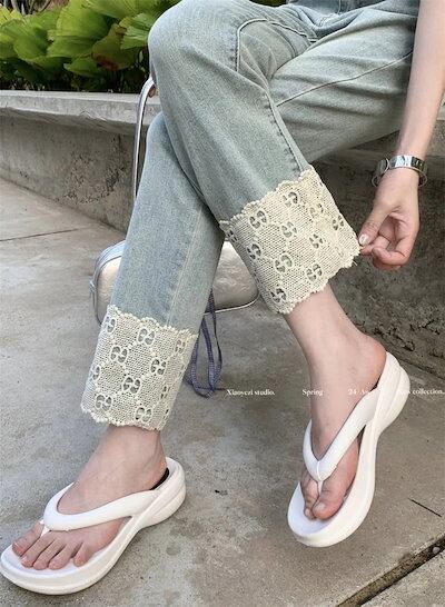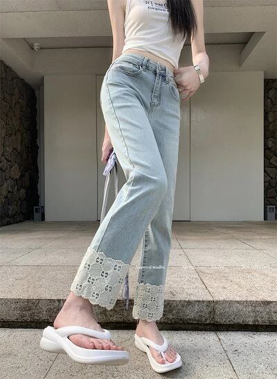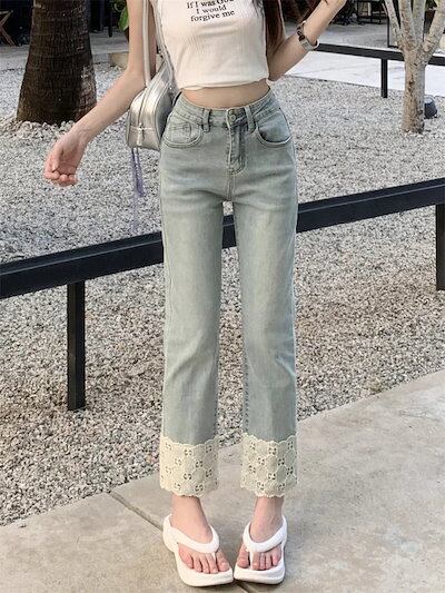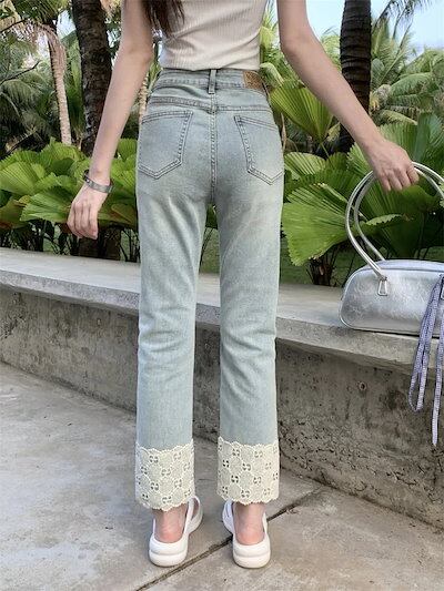 2024 初秋 デニムパンツ パンツ デニム ジーンズ クロップド丈 アンクル丈 レース ストレート ハイウエスト 脚長効果 美脚効果 細見え 水色 ライトブルー カジュアル おしゃれ かわいい 韓国