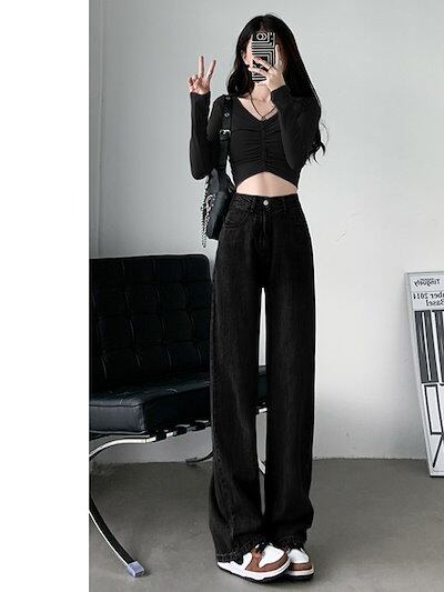 2024 初秋 デニムパンツ パンツ デニム ジーンズ ワイド ストレート ハイウエスト 脚長効果 美脚効果 細見え カジュアル おしゃれ かわいい シンプル レディース お出か 韓国ファッション