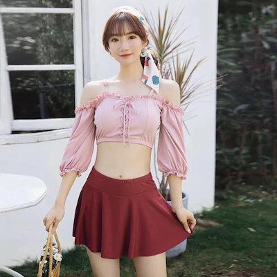 2024 人気 水着 レディース ビキニ オフショルダー ビスチェ風 3点セット 2way レースアップ水着 タンキニ ハイウエスト フリル水着 体型カバー スカート 女性 セパレート