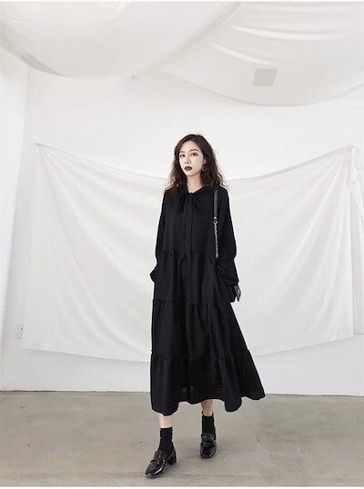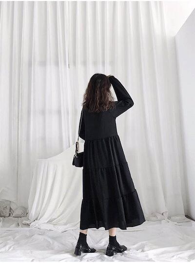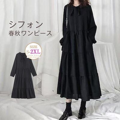 ワンピース レディース ロングワンピース 黒ワンピース 長袖 フレア ロングワンピ ミモレ丈 シフォン 着痩せ 大きいサイズ 体型カバー ゆったり ゆったり 黒 キレイめエレガント カジュアル 冠婚葬