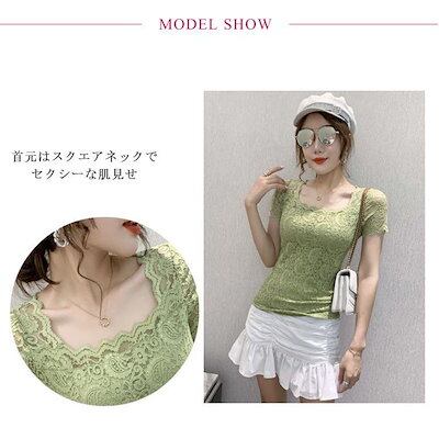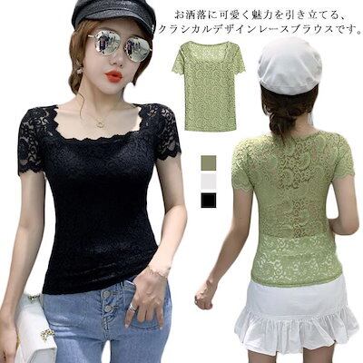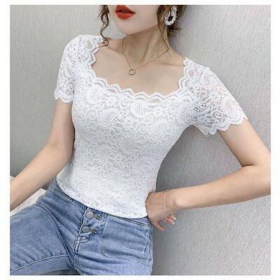 レディース トップス スクエアネック 半袖 レース 花柄 トップス 総レース 裏地付き カットソー 刺繍 トップス スリム インナー フェミニン ブ