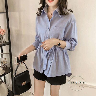 高級な質感 シャツ レディース 長袖 綿混紡 大人 秋 春 トップス 20代 30代 40代 50代 ママ 母 OL 羽織り 前開き 韓国ファッション ドロスト 紐 ラウンド裾 無地