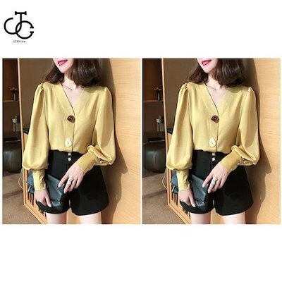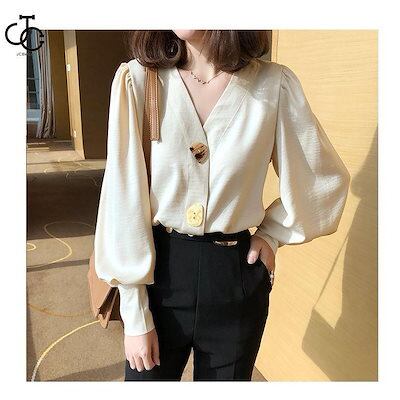 人気商品超目玉 ブラウス レディース シャツブラウス 春 秋 ぽわん袖 レトロ バルーンスリーブ Vネック クラシック フランス風 通勤 ボタン付き 不規則ボタン 長袖 おしゃれ
