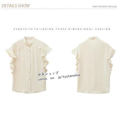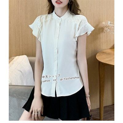 半袖ブラウス 無地 シフォンシャツ トップス フリル袖 レース 切り替え きれいめ 夏秋物 レディース 気質 着痩せ 韓国風 お出かけ デート 食事会 二次会