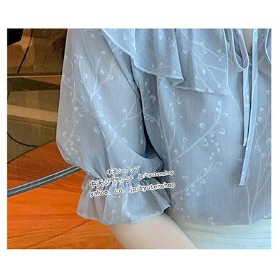 ブラウス シフォン トップス 夏秋 ベルスリーブ 半袖 ボタニカル柄 胸元リボン キレイめ 着痩せ レディース お出かけ 通勤 30代40代 新作 グレー