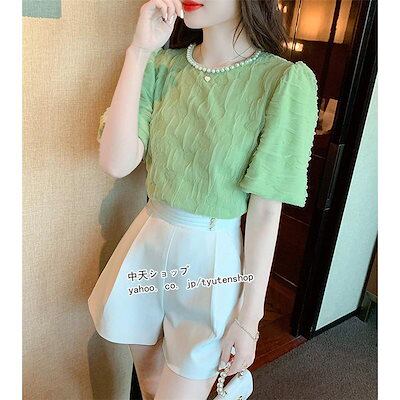 ブラウス レディース 半袖tシャツ 夏秋新作 パフスリーブブラウス トップス 丸首 着痩せ キレイめ 韓国風 おしゃれ レース 切り替え ブラウス カジュアル