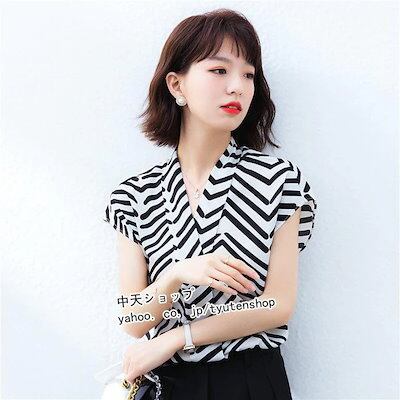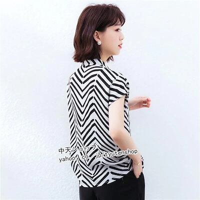 ブラウス レディース シャツブラウス シフォンブラウス トップス vネック 半袖 柄 ストライプス おしゃれ 着痩せ シャツ シンプ ビジネス オフィス 大人